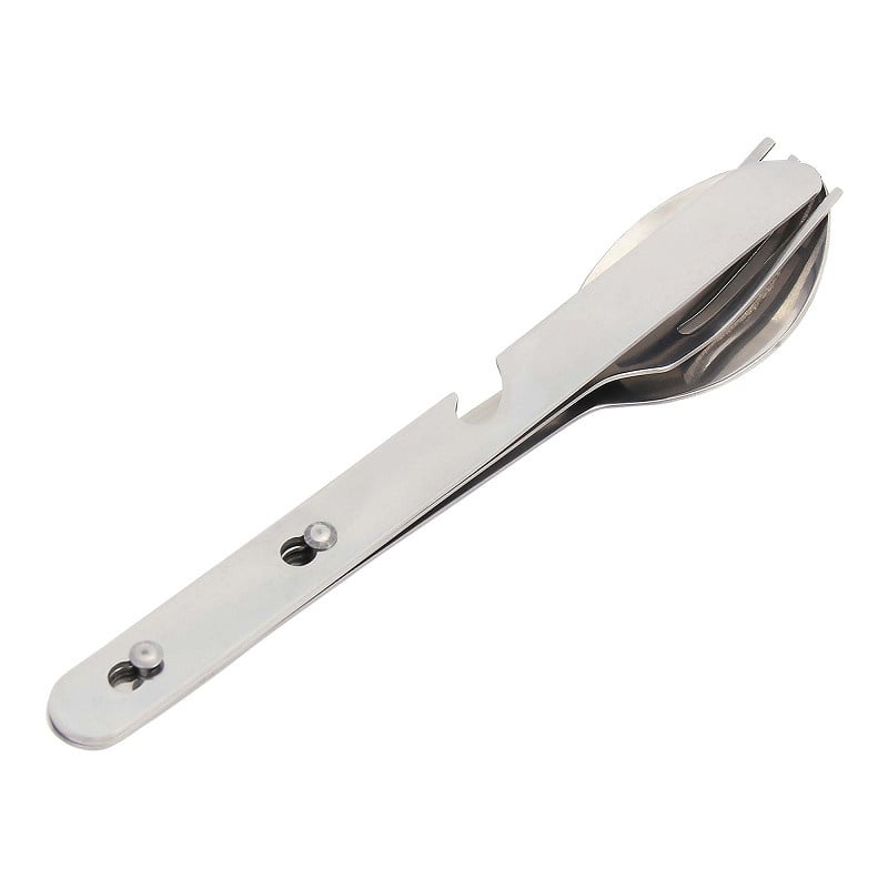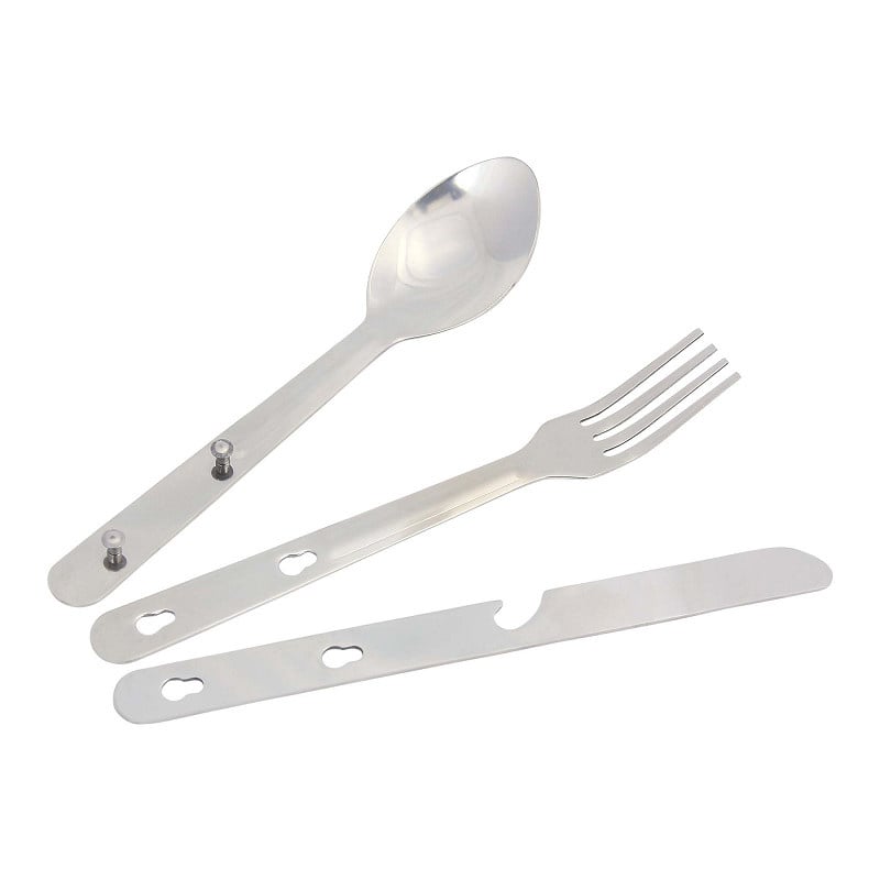 Het mes en de vork klikken vast op klinknagels op het handvat van de lepel.
