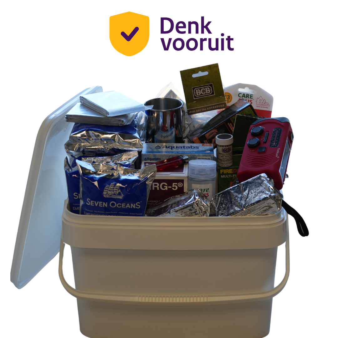 Bij een stroomuitval, overstroming of andere noodsituatie adviseert de Rijksoverheid via de campagne Denk Vooruit om minimaal drie dagen zelfvoorzienend te zijn. Dit Compleet Noodpakket in Emmer is daarop volledig afgestemd: 22 zorgvuldig geselecteerde producten, samengebracht in één robuuste, stapelbare 20-liter emmer met deksel die zelf óók dienst kan doen als zitplek, opslag, of zelfs toilet.