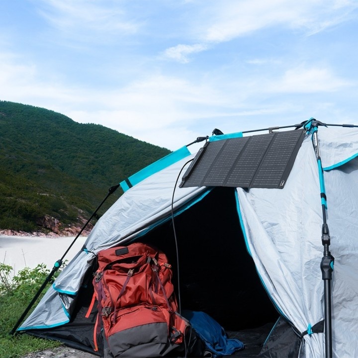 Dankzij de opvouwbare structuur met vier panelen wordt het draagbare zonnepaneel aanzienlijk kleiner wanneer je hem opvouwt (ongeveer het formaat van een kleine laptop) en past hij makkelijk in compacte ruimtes zoals rugzakken, SUV's of minibusjes. Ook kun je met de meegeleverde haken het paneel aan de oogjes in de hoeken van het paneel ophangen.
