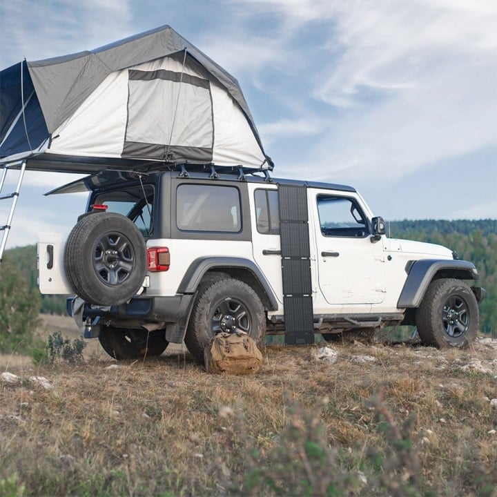 Dankzij de opvouwbare structuur met vier panelen wordt het draagbare zonnepaneel aanzienlijk kleiner wanneer je hem opvouwt (ongeveer het formaat van een laptop) en past hij makkelijk in compacte ruimtes zoals rugzakken, SUV's of minibusjes. Ook kun je met de meegeleverde haken het paneel aan de oogjes in de hoeken van het paneel ophangen.